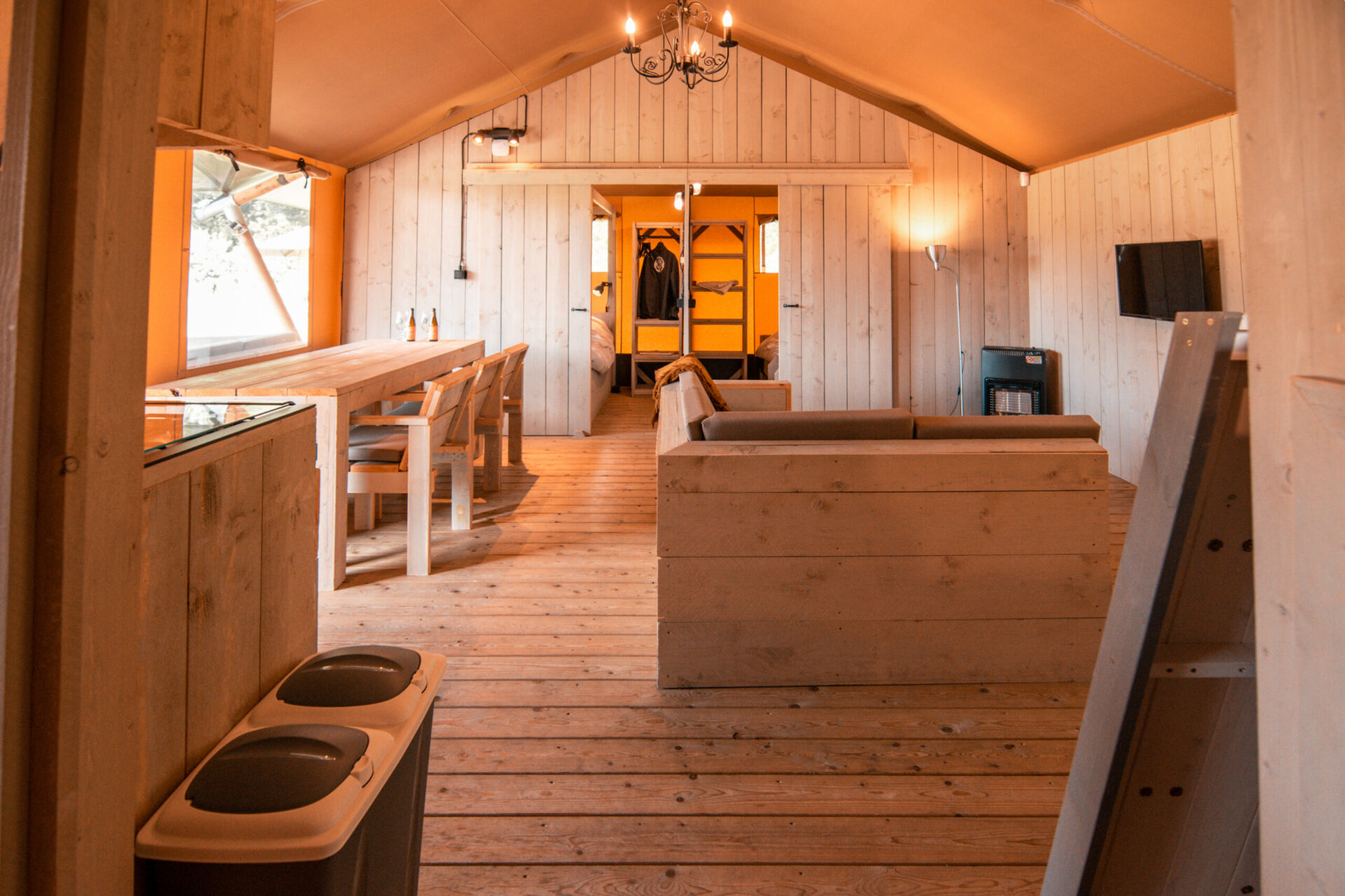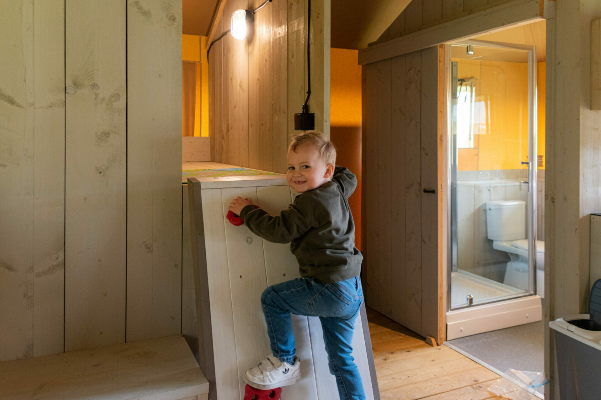 In onze Medley lodge zit zelfs een glijbaan in voor de kinderen! Hoe geweldig is dat! Genieten van het buitenleven bij Glamping De Bosweide! Glamping wordt zo heel leuk gemaakt!